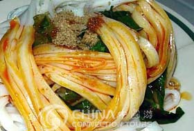 The diet in Dunhuang revolves around wheat flour noodles. They are served with lamb, chicken, and beef. A noodle dish called Dunhuang Rang Pizi has long been one of the most popular dishes in the city. These noodles are made from pea flour and are clear, white, cool and slippery. They are seasoned with hot peppers for a cool, yet spicy, taste that is just perfect for desert weather.
