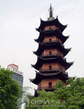 Tianfeng Pagoda was so named because it was constructed during the reign of Wu Zetian the Empress of Tang Dynasty when she was enthroned ("Tianfeng" in Chinese means "enthronement under the will of Heaven"). The original pagoda was hexagonal in shape and about 51 meters high. A story goes that during construction of the pagoda, sand was piled up for ease of operation, and as a result, large amount of sand and mud was left over (that is why the Dashani (Big Sand and Mud) Street and the Xiaoshani (Small Sand and Mud) Street acquired their present names. Local people regarded the pagoda a holy tower patronizing the prefecture. The pagoda was once used as a beacon tower in wars. And in peaceful days, bright lanterns were lit on the top of the pagoda, lighting up paths for boats and pedestrians. The pagoda was destroyed by the war during 1128 and 1130, and was rebuilt in 1144. It was a thirteen-story pagoda. The outer skirts, platform and baluster of the pagoda were destroyed by fire in 1798, and were rebuilt in 1935. A bronze dagoba made by Qian Hongshu, King of Wuyue in the Five-dynasty period, was found on the top of the pagoda during maintenance work in 1957; the dagoba bears the inscribed year of 955. 'Underground Palace' was found when an inspection was conducted upon the foundation of the pagoda in 1982, and silver ingots, silver pagodas and the like were unearthed; the year inscribed on the 'Underground Palace' as well as on the stone case found was 'the 14th year of Shaoxing Reign of Song Dynasty'. The unearthed bronze coins dated the latest were the coins marked with "Yuanbao Reign of Song Dynasty", which conformed with the literature saying the pagoda was destroyed by war during the reign of Emperor Jianyan of Song Dynasty, and was rebuilt by Monk Dehua during the Shaoxing Reign'. In 1984, the pagoda tilted severely, and crevices were found on the wall. The body of pagoda was pulled down for a thorough repair, and was found to measure 42.5 meters high; hundreds pieces of artifacts dating back to Song or Yuan dynasty like seals, bricks and classic religious scriptures were found inside the pagoda. The repair work started from September 1987 and lasted till November 4, 1987, with RMB1,600,000 spent. The renovated pagoda measures 51.5 meters high (decorations on the pagoda top inclusive), and has 7 grades of outer skirts tilting upwards splendidly. On each skirt are the cloisters well protected by balusters. The body of the pagoda is dark red, and the outer skirts black, offering an air of simple and classic loftiness. Tianfeng Pagoda was listed among the key historic site under municipal protection in May 1961 and in December 1981.